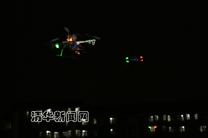 图为飞行中的四旋翼飞行器彩灯闪闪。学生记者 李钧翔 摄
