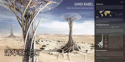 "SAND BABEL”即“通天沙塔”,建于广袤的沙漠之中,是一个可供科学考察和休闲观光的生态建筑群。“建筑群”可划分为两个部分,地上部分由众多独立的建筑单体构筑,形成了错落有致的“沙漠社区”;地下和地表部分由建筑群相互连接,形成了多种功能的“管网系统”。
