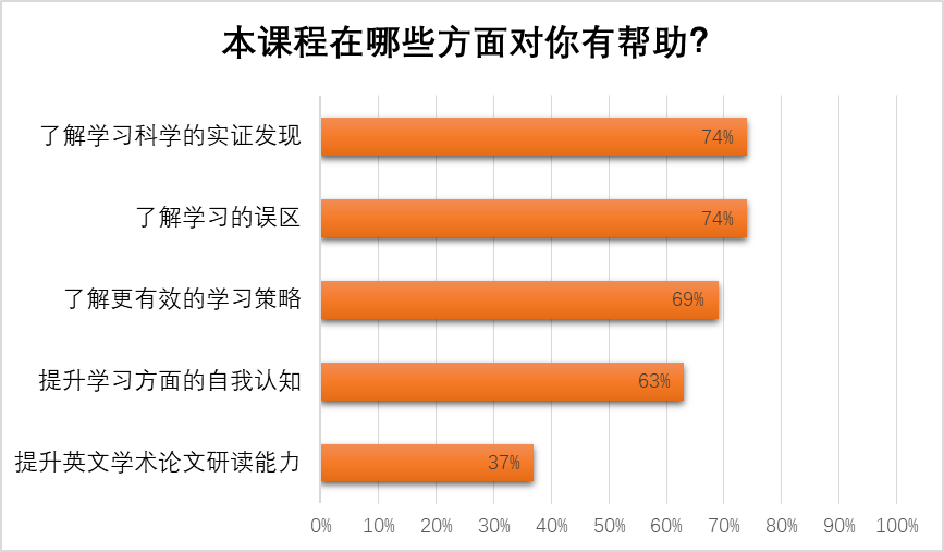 课程结束的第16周,我们进行了学习效果反馈调查。如下图所示,超过80%的学生认为让他们受益最多的是课堂讲授、随堂测试、论文研读报告,显示出这些主要教学活动是有成效的。近50%的学生认为让他们受益最少的是出勤管理,间接说明对大多数学生而言,线上学习是自主自发的,而不是监管的结果。近70%的学生认为如果增加课堂讲授、随堂测试、论文研读和报告,学习效果会更好,有17%的同学认为如果增加分享讨论,学习效果会更好;25%的学生认为减少主观陈述练习学习效果会更好,这些结果客观反映了生成性学习活动的挑战性和难度,另一方面也反映了这些活动在内容和形式上有进一步优化。总体而言,92%的学生认为本课程对自己有帮助或非常有帮助,其中70%以上的学生认为本课程在了解学习科学的实证发现、了解学习的误区以及了解更有效的学习策略方面对自己很有帮助。