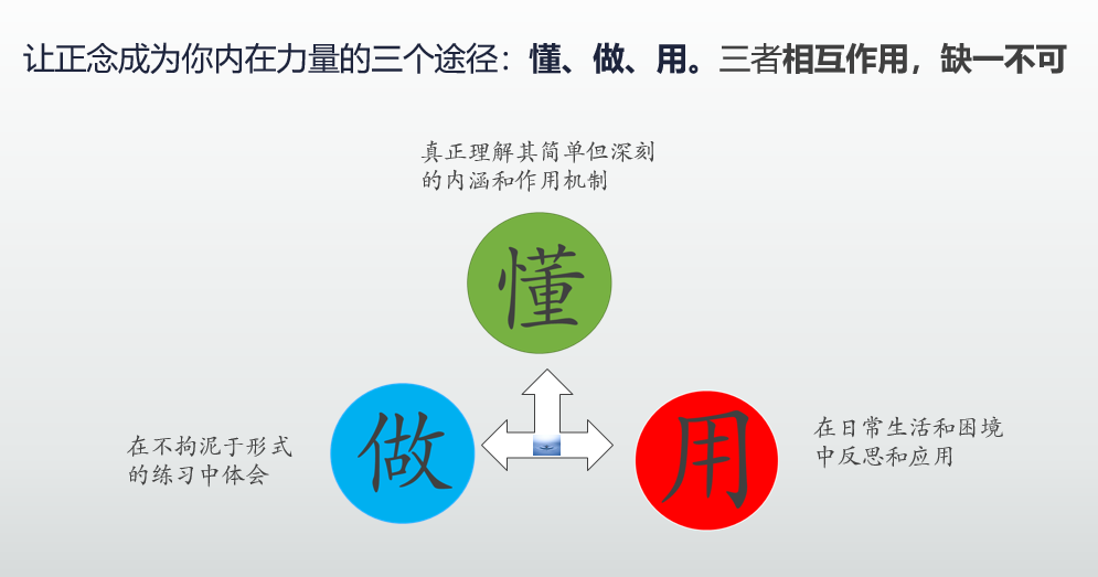 1)清晰明确的学习方案。首先,师生明确共识,本课程采用“懂-做-用”三位一体的课程设计。通过“实践”“反思”和“构建”帮助学生获得真正的掌握和运用的能力。对任何一项知识或技能来说,真正掌握意味着当你需要它时它还在,能在未见过的情境中运用它。“已知幻觉”(illusion of knowledge)是常见的学习误区之一:学习者误将熟悉(familiarity)或流利(fluency)当成掌握(mastery),对自己的知识掌握和运用能力缺乏准确认知。正念是指对当下不加评判的觉察。近年来,大量心理学、医学和神经科学的研究表明正念可以有效缓解心理疾患,其机制在于不同的心理疾病有一个共同特点,即想法和情绪在疾病的形成和恶化中扮演了重要角色。正念帮助人更好地觉察心的状态,从而安住在当下实相之中,不被思绪和情绪之河卷走。对学生而言,正念有助于提高专注力,培养内心稳固,减少想法和情绪产生的“第二支箭”的苦恼,使学习更有成效,生活更加幸福。对很多人来说,正念是非常熟悉的词汇,有关正念的讲座、书籍和工作坊随处可见。然而熟悉并不等于掌握,一知半解相反会带来危害。如下图所示,本课程提出“懂-做-用”三位一体的课程设计,旨在帮助学生“真懂”——真正理解其简单但深刻的内涵和作用机制、“真会做”——不拘泥于形式的反复练习(去除如各种形式主义的前置条件),使正念练习在日常生活中无处不在、“真能用”——能够运用正念智慧解决自己的实际问题。
