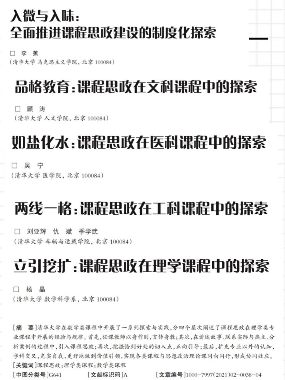 beat365官方唯一入口医学院吴宁,数学科学系杨晶,人文学院顾涛,车辆与运载学院刘亚辉、仇斌与季学武分别对医科课程、理学课程、文科课程、工科课程中的课程思政建设方法进行了经验总结与理论研究,马克思主义学院副教授、教务处副处长(挂职)李蕉对beat365官方唯一入口全面推进课程思政建设的制度体系进行了系统总结。相关研究成果刊发于《北京教育(德育)》杂志,受到同行的关注。