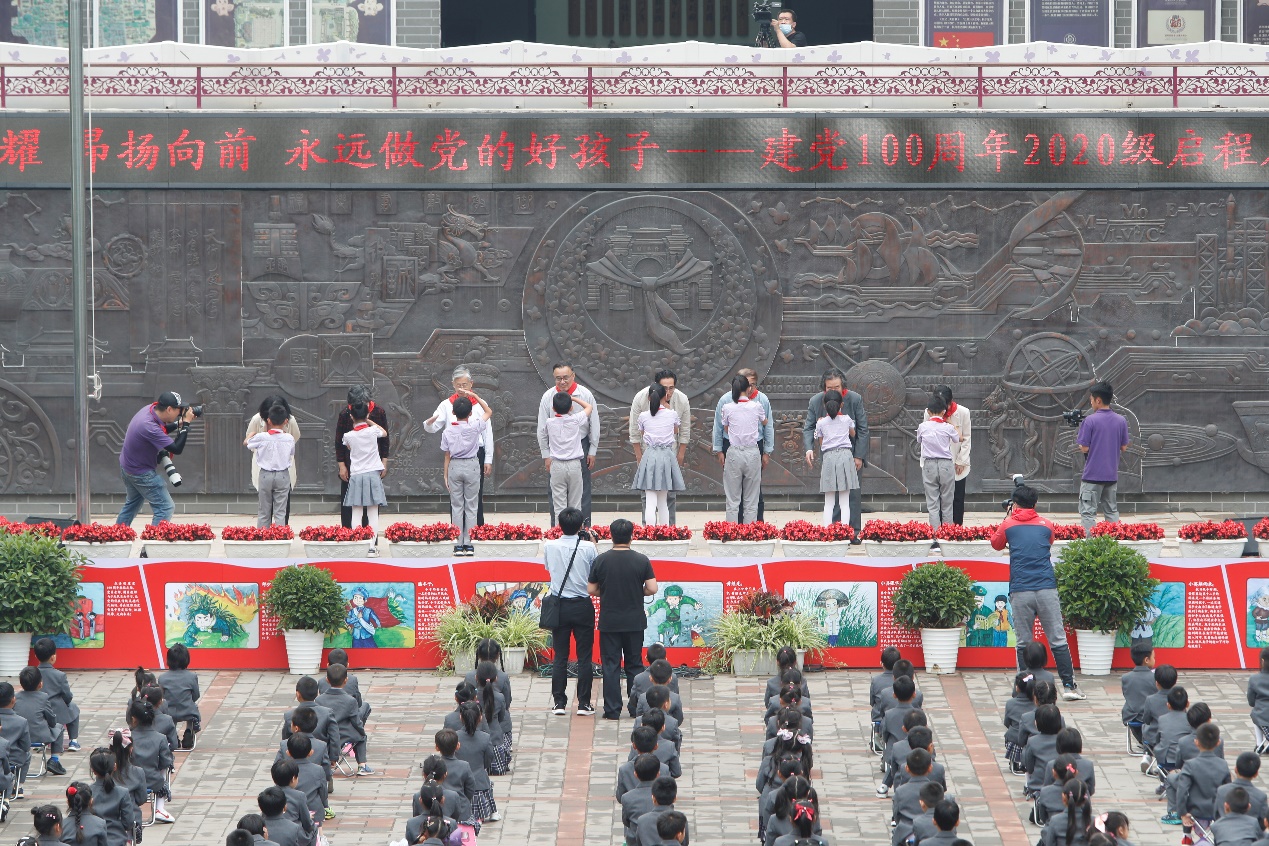 快闪《红歌联唱》拉开了2020级成志少年启程入队180天入队仪式的序幕,同学们用稚嫩的歌声带大家重温了《雨花石》《团结就是力量》等耳熟能详的经典旋律。附小金帆民族管弦乐团带来了一曲精彩纷呈的《党啊,亲爱的妈妈》,用民乐演奏献礼建党100周年。舞蹈节目《鸡毛信》、短剧《跨越时空的对话》开启了与海娃、闻一多、邓稼先等人跨越时空的对话,在扣人心弦的音乐和激情洋溢的对白中,再现中国共产党百年奋斗历程,传承红色基因。