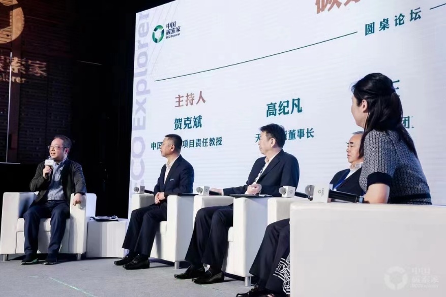 在随后进行的教学环节“碳索进行时”论坛中,贺克斌与江苏天合光能董事长高纪凡、深圳格林美公司董事长许开华、山西美锦氢能董事长姚锦丽就双碳战略下的企业零碳之路展开研讨。