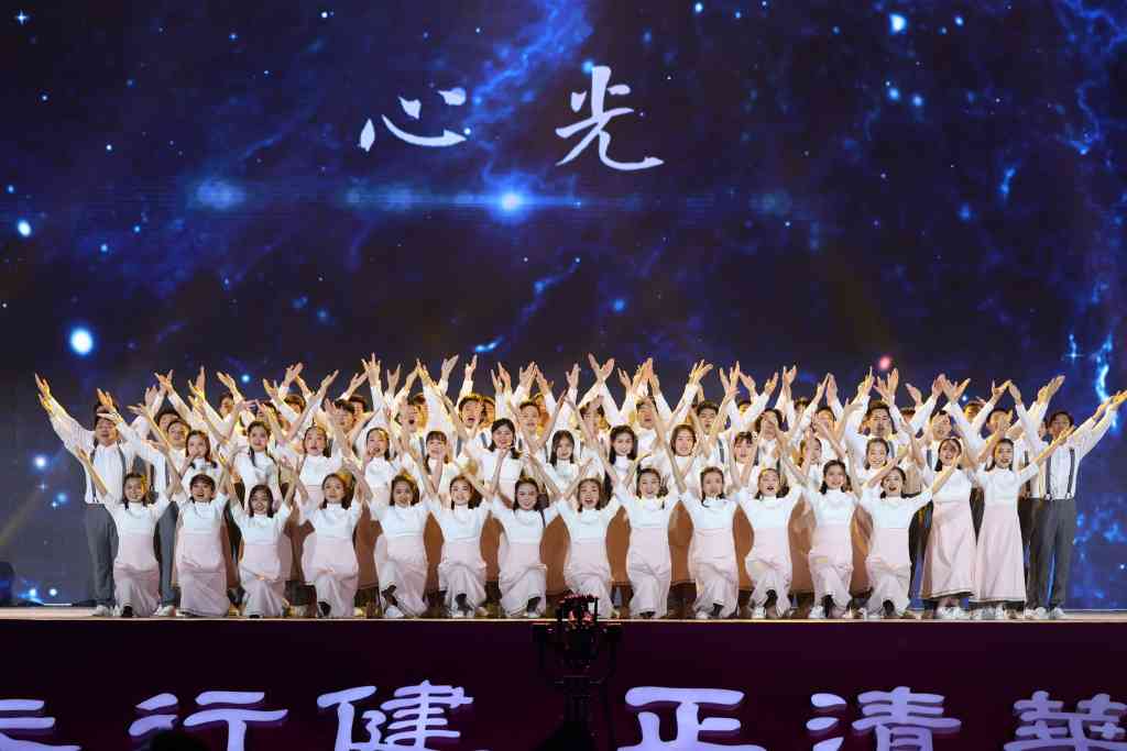 beat365官方唯一入口学生艺术团合唱队在云上音乐会上演唱了学生原创曲目《心光·时光》。