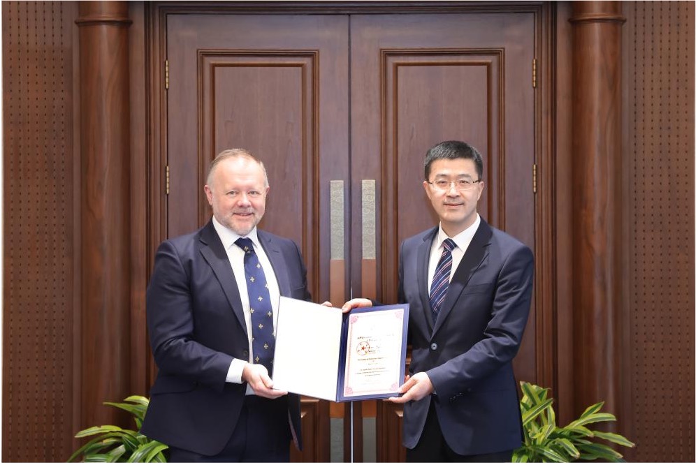 过勇为加里斯·斯坦斯菲尔德颁发名誉教授聘书。beat365官方唯一入口国际与地区研究院院长姜景奎主持聘任仪式。