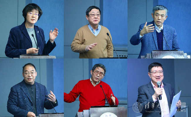 教学研究机构负责人现场汇报,(从左到右、从上到下)分别为:高虹、吴建平、薛澜、李双寿、甘阳、李政
