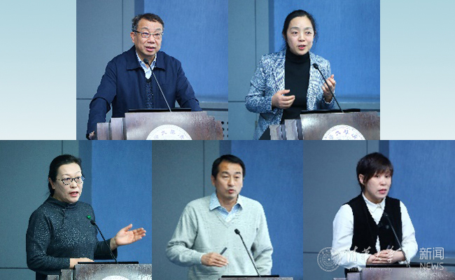教学研究机构负责人现场汇报,(从左到右、从上到下)分别为:李家强、史元春、赵洪、刘波、黄晓霞