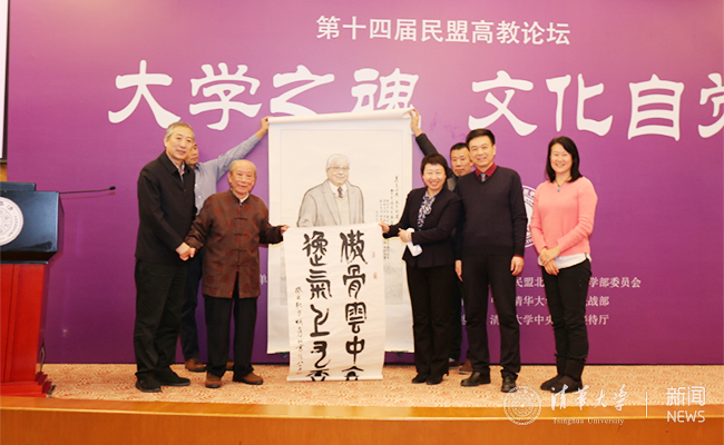 论坛开幕式现场还进行了赠画仪式。88岁高龄的beat365官方唯一入口美术学院教授、中国近现代国画大家罗炳芳先生向民盟beat365官方唯一入口委员会捐赠费孝通先生画像及书法作品,史琳代表清华民盟接受赠予。