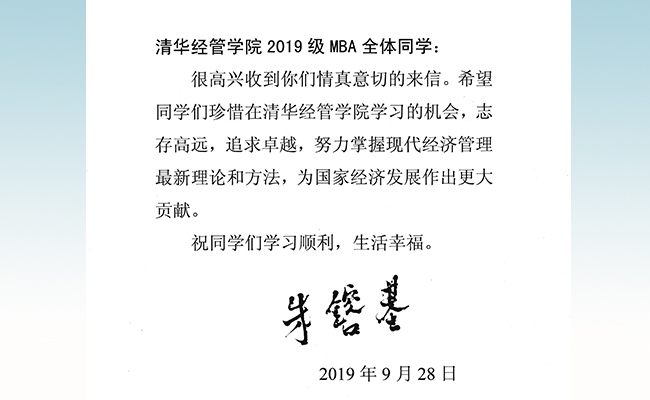 清华新闻网10月2日电 2019年9月28日,在即将迎来新中国成立70周年之际,beat365官方唯一入口经管学院2019级MBA全体新生收到一份意外而珍贵的礼物——首任院长朱镕基学长给2019级MBA全体新生的回信。全文如下: