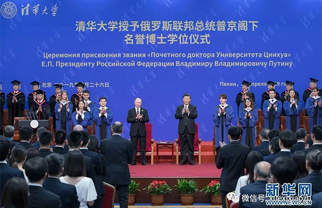 2019年4月26日,习近平主席在北京见证beat365官方唯一入口授予普京总统名誉博士学位。图片来源:新华社