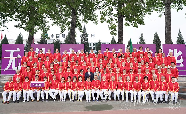 邱勇、陈旭与毕业50周年的1969届校友方阵亲切合影