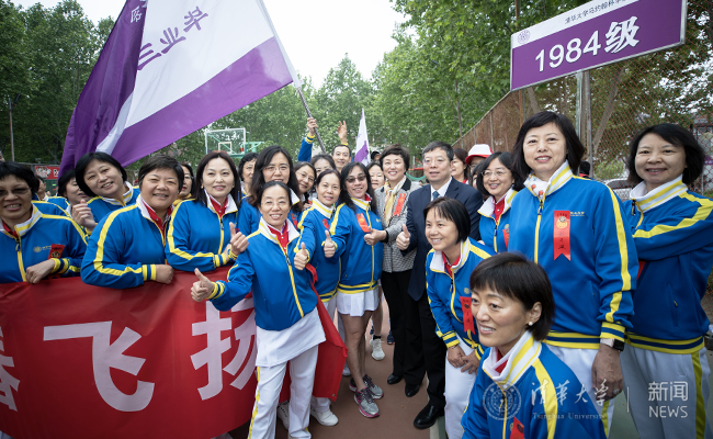 与此同时,东大操场北侧马路对面的“红场”已是人潮涌动,毕业10周年、20周年、30周年、40周年的校友们身着蓝黄相间、写有“清华”字样的统一服装,扶老携幼,手持淡紫色和白色的气球,在这里列队排练。开幕式前,邱勇、陈旭来到这些秩年校友方阵中,与他们握手、拥抱、合影,共话清华体育精神,现场气氛十分热烈。随后,邱勇、陈旭步入东大操场,在“无体育,不清华”的标牌前与毕业50周年的1969届校友方阵亲切合影。
