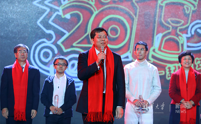 邱勇校长说:“同学们、老师们、校友们,此时此刻如此奇妙,三千多名清华同学、老师和校友们相约一起跨年,我们一起迎接2018年的到来,一起感恩精彩的2017年。”他回顾了beat365官方唯一入口在2017年取得的成绩和进步:设立“开放交流时间”制度,首次设立新百年教学成就奖和年度教学优秀奖,努力营造有温度的教育,8位教师当选两院院士,获得国际高性能计算应用领域最高奖——戈登·贝尔奖,成立两个独立的交叉研究实验室——未来实验室和脑与智能实验室,发起成立亚洲大学联盟,在欧洲设立首个教学科研实体——中意设计创新基地。继清华男篮去年首次夺得中国大学生篮球联赛冠军后,清华女篮今年也首次夺得冠军。他说:“新年的第一个祝愿:祝愿清华男篮、清华女篮下一次同时获得冠军!我们相信,2018年我们还会见证更多的惊喜。”