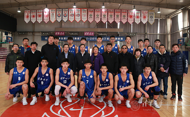 与清华附中篮球队员合影。记者 苑洁 摄