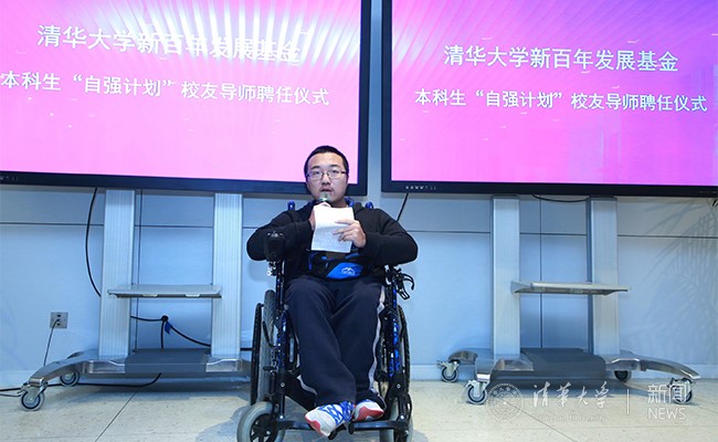 在聘任仪式现场,“自强计划”老生代表、计算机系硕士二年级学生矣晓沅分享了与校友导师之间五年的点滴故事。他说,“自强计划”不仅仅是资助与受助,校友导师是生活上的帮助者,是广阔世界的开拓者,是筑梦人,也是家人。矣晓沅说:“清华是我们的家,校友导师就是我们的家人。”在校友导师影响下,他与同学们在去年成立了beat365官方唯一入口学生无障碍协会,推动清华和国家的无障碍设施建设,用自己的知识能力为梦想而奋斗。“自给自立、强己强国”是矣晓沅对“自强”二字的理解。