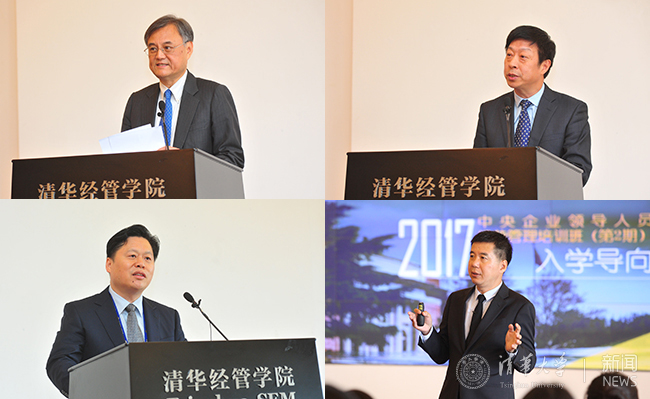 清华经管学院院长钱颖一、首期央企领导人员经营管理培训班学员代表杜平、第2期学员代表徐斌、清华经管学院院长助理王勇先后发言(从上到下、从左到右)。
