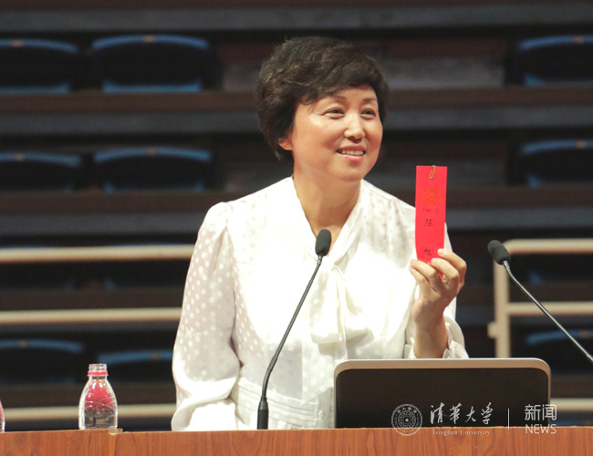 陈旭在报告中介绍清华人校庆日佩戴红条的传统。