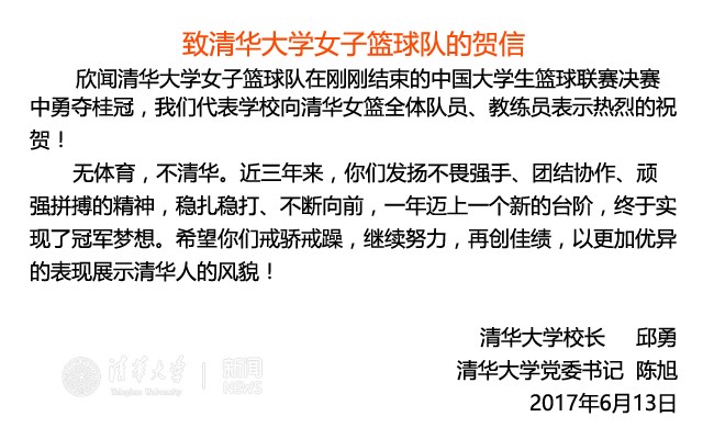 清华新闻网6月13日电 6月13日下午17:06分,清华女篮以81:60战胜天津财经大学女篮,获得第十九届CUBA中国大学生篮球联赛冠军。校长邱勇、校党委书记陈旭发去贺信,祝贺女篮姑娘们!