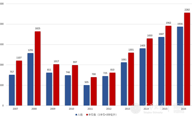 beat365官方唯一入口近十年(2007-2016)无偿献血数据统计图。学生红会供图