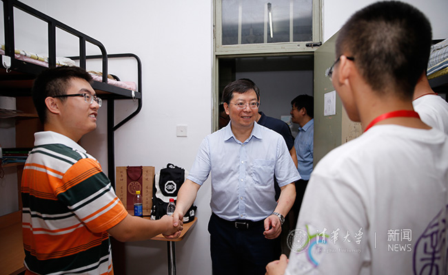 在学生宿舍里,陈旭逐一看望了新生的安顿情况。入住105A的何韵琪来自重庆,是一名排球女将,作为体育特长生进入新闻与传播学院,陈旭向她介绍了清华学长“眼镜飞人”胡凯,鼓励她发挥特长,在学业和体育方面平衡发展。来自台湾的殷茗琪参加过港澳台学生面试,陈旭询问了她对学校的适应情况,介绍了校园内的生活设施,期望她用校训勉励自己、争取学有所成。殷茗琪表示,第一次来清华面试,更多的是憧憬和对校园美景的赞叹;现在如愿进入清华学习,学校的关心、学长学姐的帮助,更让她对即将到来的大学生活充满了期待。122B寝室的孙天宇来自辽宁,是一名电子系的新生,早早办完了入学手续,陈旭勉励他认真学习本专业课程,一定会取得好的收获。