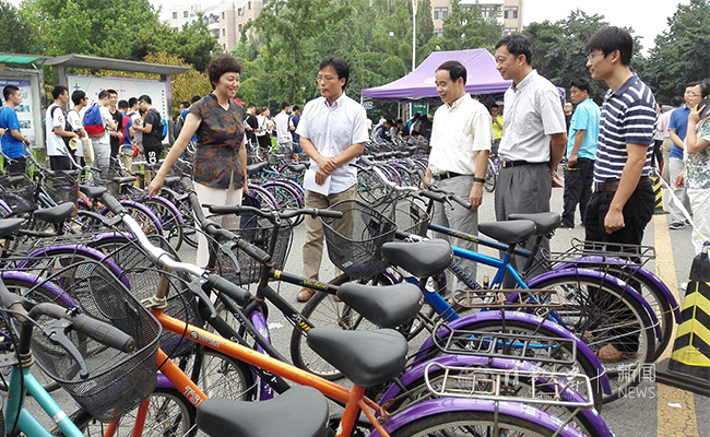 陈旭一行还来到再生自行车发放点,仔细查看了调整后的自行车性能,并叮嘱领取自行车的同学们注意骑行安全。今年,绿色办公室和保卫处面向新生提供了400辆再生自行车,在注册当天排号发放。