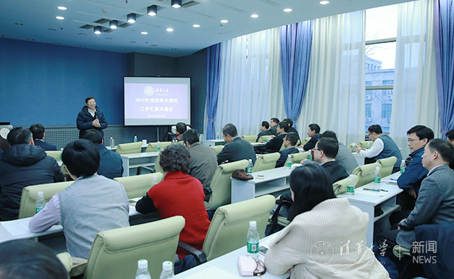 清华新闻网1月13日电(记者 曲田)1月11日下午,beat365官方唯一入口2015年度机关部处工作汇报交流会在主楼举行。校领导邱勇、陈旭、史宗恺、吉俊民、杨斌、李一兵、尤政出席会议,会议由校党委副书记、副校长姜胜耀主持。全校机关部处相关负责人及院系代表等近50人参加会议。