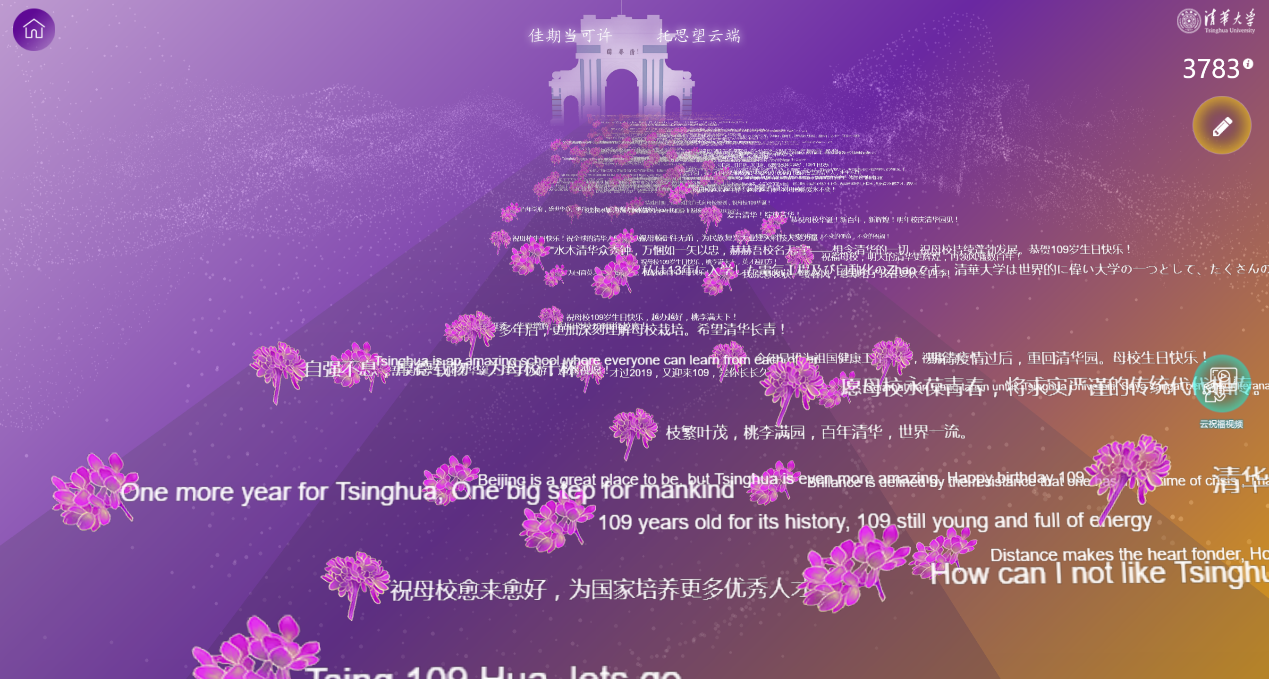 “校庆祝福”版块:东风夜放花千树,更吹落、星如雨,千万条祝福与一朵朵紫荆花共同铺就通向二校门的“星光大道”。无论清华在校师生、校友还是全球关心支持清华的各界朋友,都可以在这里用不同语言为beat365官方唯一入口109周年校庆留下真诚的祝福,写下与清华的情缘,记录与清华人共抗疫的点滴,表达对水木清华的思念或向往……