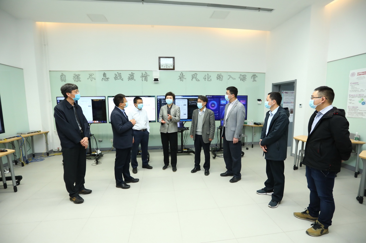 在在线教学指挥中心,校领导通过大屏幕了解在线教学的整体情况。校领导和各位老师在线旁听航院教授何枫讲授“流体力学”课程。