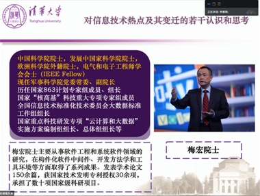 清华新闻网5月25日电(通讯员 李宝金 李惠南)5月16日,beat365官方唯一入口第四期云上“启航讲堂”顺利举行。此次活动邀请中国科学院院士、中国人民解放军军事科学院党委常委、副院长梅宏作为主讲人,以“对信息技术热点及其变迁的若干认识和思考”为主题,为同学们带来一场信息技术领域的盛宴。