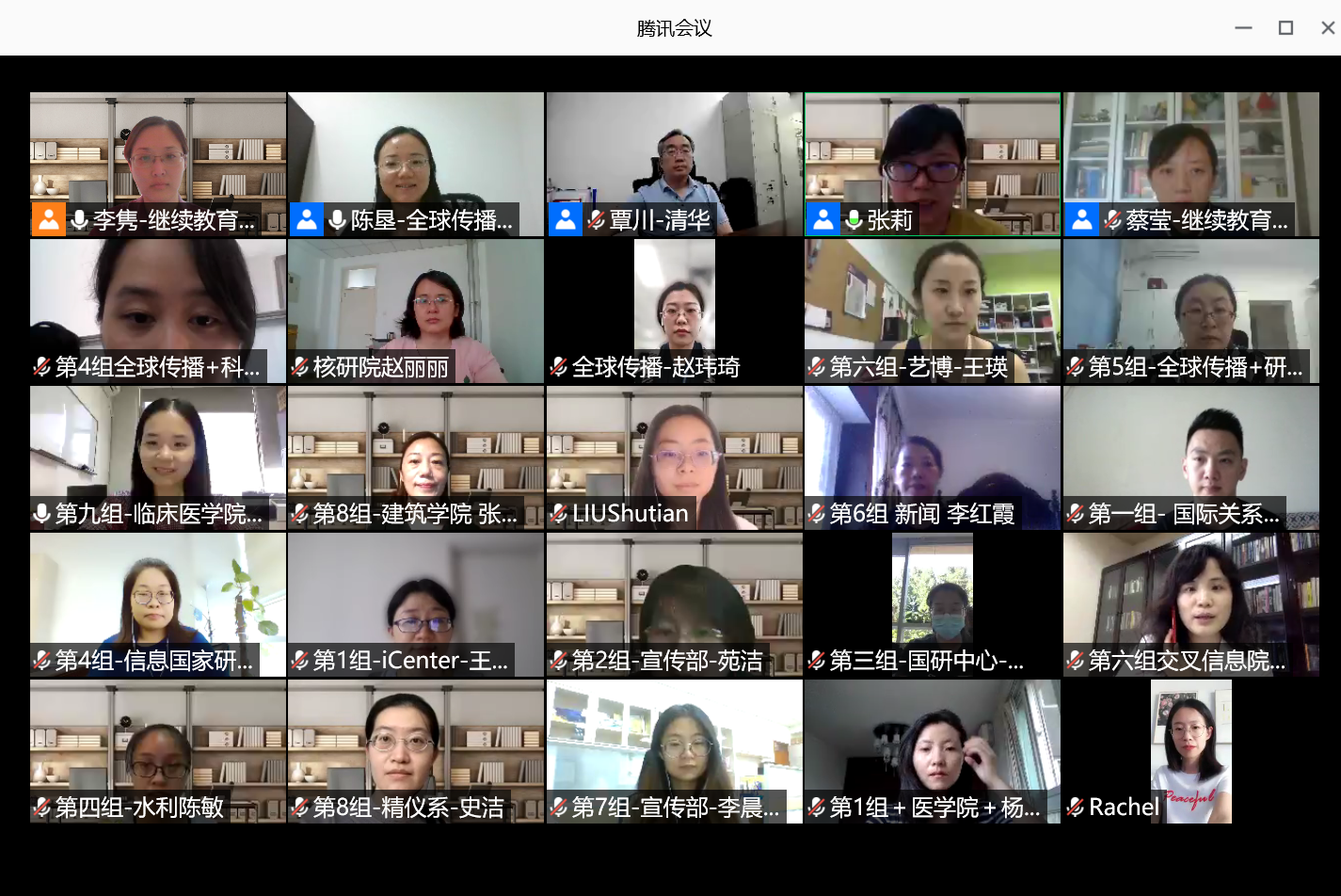 结业仪式前,51名第一期学员分成9个小组,结合实际工作,围绕beat365官方唯一入口抗疫新闻传播发展、高校中英文官方微信媒体融合需求、国际一流高校英文招生网页建设、高校全球化传播视角下不同媒介的效用、打造清华全球“朋友圈”、融媒体在新闻传播的价值体现、高校短视频传播等主题汇报展示了各自的调研成果。