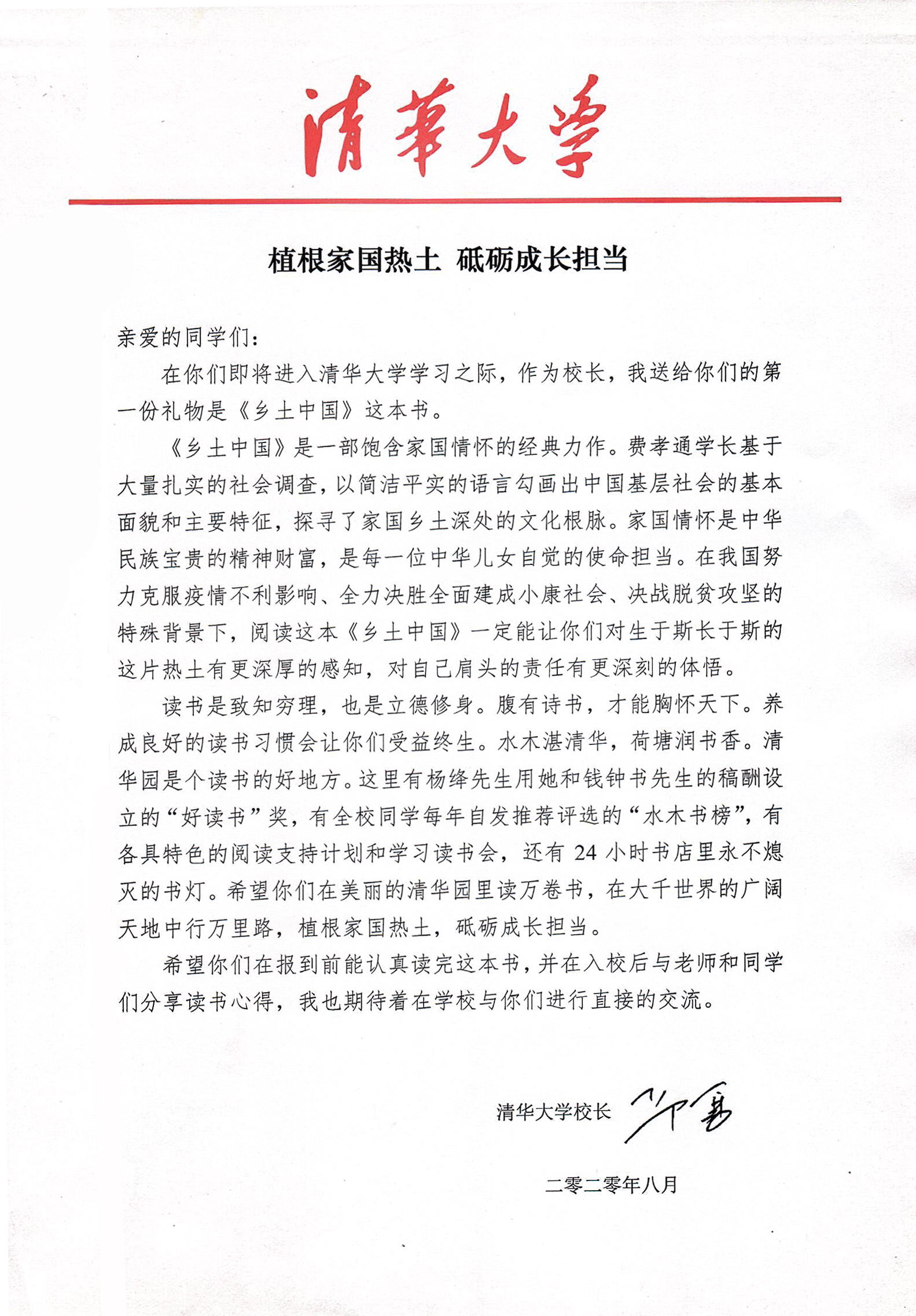 随录取通知书一起寄出的,还有校长邱勇给新生的赠书《乡土中国》以及致新生的信,寄语新生“植根家国热土,砥砺成长担当”。
