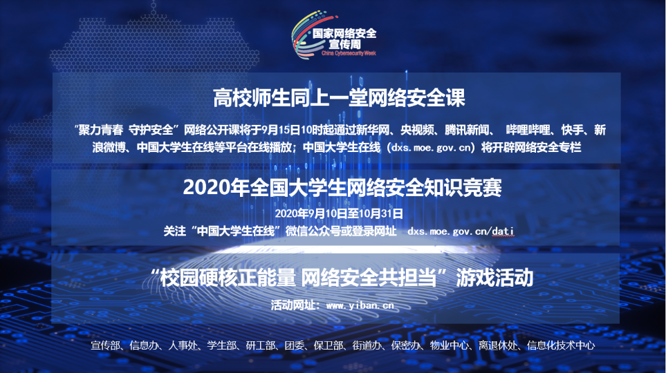 宣传周期间,学校积极组织动员广大师生参加“高校师生同上一堂网络安全课”“2020年全国大学生网络安全知识竞赛”“校园硬核正能量 网络安全共担当”等教育部组织的重点活动。围绕“网络安全为人民,网络安全靠人民”的主题,信息办、信息化技术中心、保卫部等单位结合实际工作,精心组织开展了新生安全教育、网络安全培训、网络安全技术挑战赛、网络安全主题报告会等内容丰富、形式多样、覆盖广泛的宣传教育活动。 |
