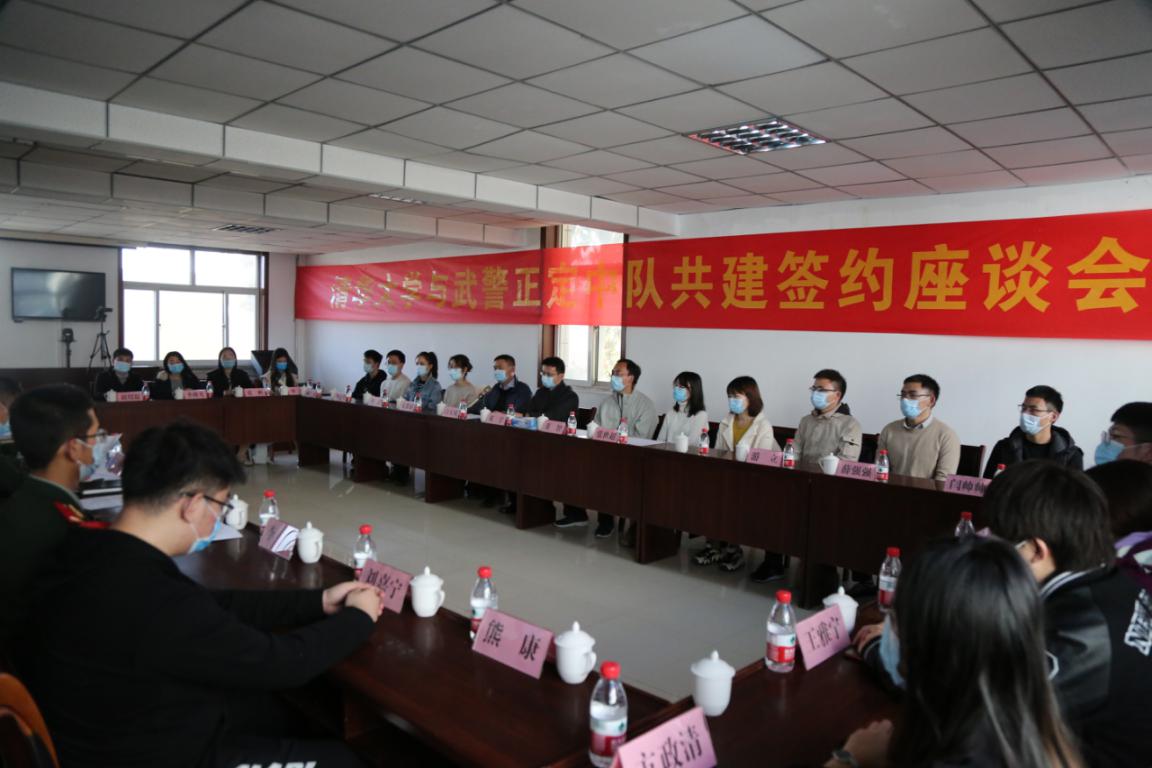 仪式后,清华师生与武警正定中队官兵举行座谈会。武警石家庄支队政治委员侯爱华介绍了武警石家庄支队的整体情况,肯定了清华退伍士兵靳发兴在正定中队服役期间的优秀表现,希望双方今后不断加强交流合作,建立更加紧密的联系。邓宇表示,本次签约是近年来清华首次与武警部队基层中队开展合作,对于学校的国防教育工作具有重大意义。曾于2018-2020年服役于正定中队的化工系本科生靳发兴在座谈交流时表示,非常感谢中队两年的培养和教育,武警正定中队锻炼了他坚韧不拔的品格和矢志不渝的精神,褪下军装的他,也一定会将这种“不怕苦、不怕累”的精神带到校园生活和学习中。