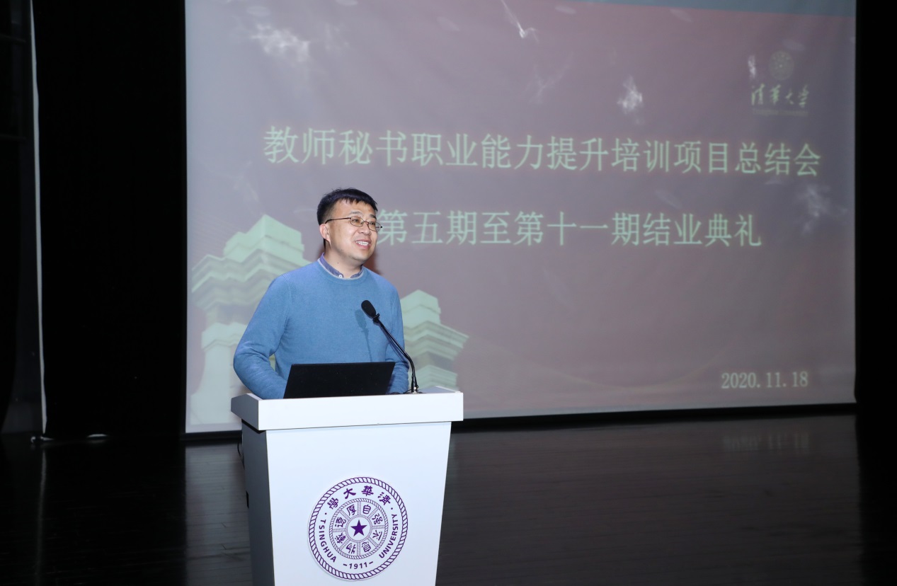 政策研究室主任孙海涛作为主办单位代表发言。他谈到,培训搭建起教师秘书间的学习平台,增进各单位、院系之间的了解与信任,在此基础上更有利于彼此间达成共识,增进合作效率。他强调,大学作为学习型组织要想有持续的生命力,需要保持不断学习的姿态,不断提升自己,不断加强对清华精神的理解,才能更好地服务学校、服务教育工作。从2018年至今,教师秘书培训项目经过两年发展,取得丰硕成果,未来需要依靠每个人的努力把项目越办越好。