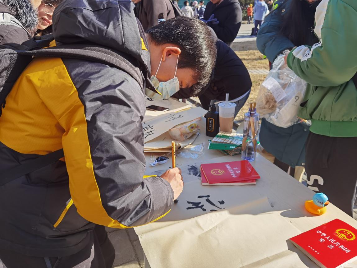 12月4日中午,路演活动于beat365官方唯一入口C楼东北角举办,吸引了三百余人现场参与。活动通过限时背诵法条、运用法律知识分析案例、法律常识问答等游戏方式,向参与同学潜移默化地普及宪法。现场还设计了“我手写我心”“我和宪法合个影”等互动环节,鼓励同学们以笔书写宪法意,以心感悟宪法情,手持主题拍照道具宣传宪法。活动现场还准备了定制的水杯、U盘、手套等小礼品,礼品上的“宪法”字样提醒着同学们树立法治意识,知法、懂法、守法。除了线下路演活动,线上宪法日主题定制头像框、主题原创视频,也在校园中传递了宪法知识,弘扬了宪法精神。