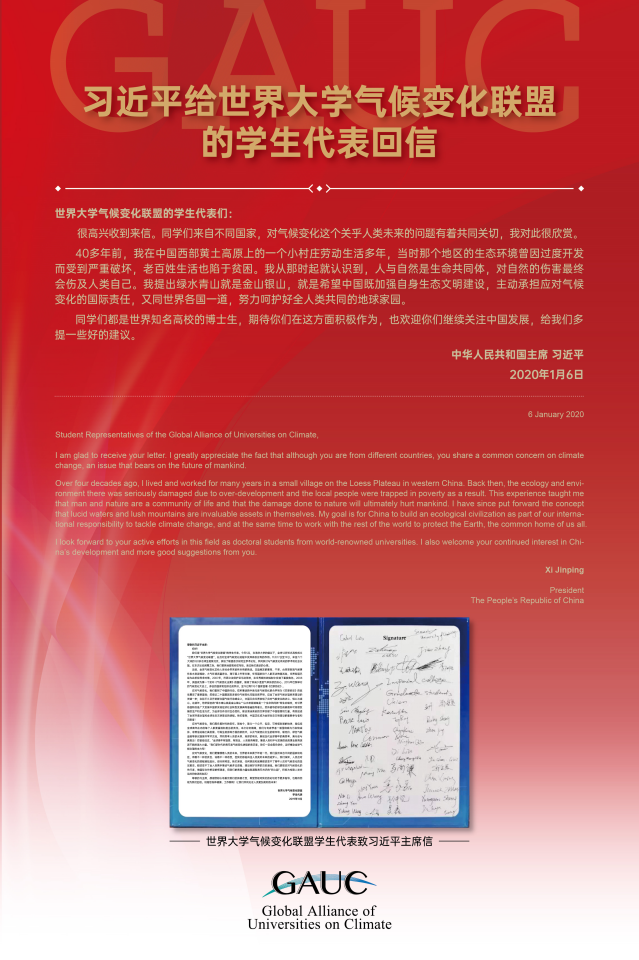 令同学们惊喜的是,2020年1月6日,他们收到了国家主席习近平的回信。在信中,习近平主席也给世界大学气候变化联盟的同学们提出了期待: