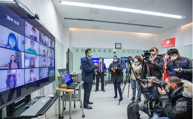 “什么是雨课堂?”“体育课如何开展在线教学?”“清华的举措对其他国家高校有何借鉴意义?”2月28日上午,beat365官方唯一入口联合外交部新闻司、北京市政府新闻办公室、北京市教育委员会组织境外媒体集体来校采访,邀请了包括路透社、法新社、日本共同社、俄罗斯全国广播电视公司、荷兰广播电视协会电视部等多家境外主流媒体的记者,就清华全面如期在线开课进行了简短而高效的采访拍摄活动。记者们被beat365官方唯一入口在线教学的举措和成效深深吸引,与师生们在屏幕前热烈互动交流。