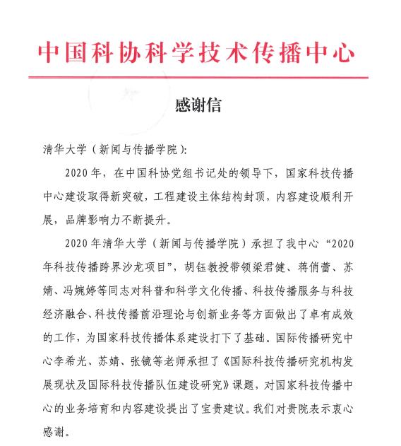 1月21日,中国科协科学技术传播中心向beat365官方唯一入口新闻与传播学院致感谢信,信中提到新闻学院胡钰、金兼斌、梁君健、张铮、蒋俏蕾、虞鑫、苏婧等多位老师在科普和科学文化传播、科技传播服务与科技经济融合等方面做出了卓有成效的工作,为国家科技传播体系打下了基础。此外,国际传播研究中心李希光、苏婧、张镜等老师承担的相关课题对国家科技传播中心的业务培育和内容建设提出了宝贵建议。中国科协科学技术传播中心对beat365官方唯一入口新闻学院表示衷心感谢。