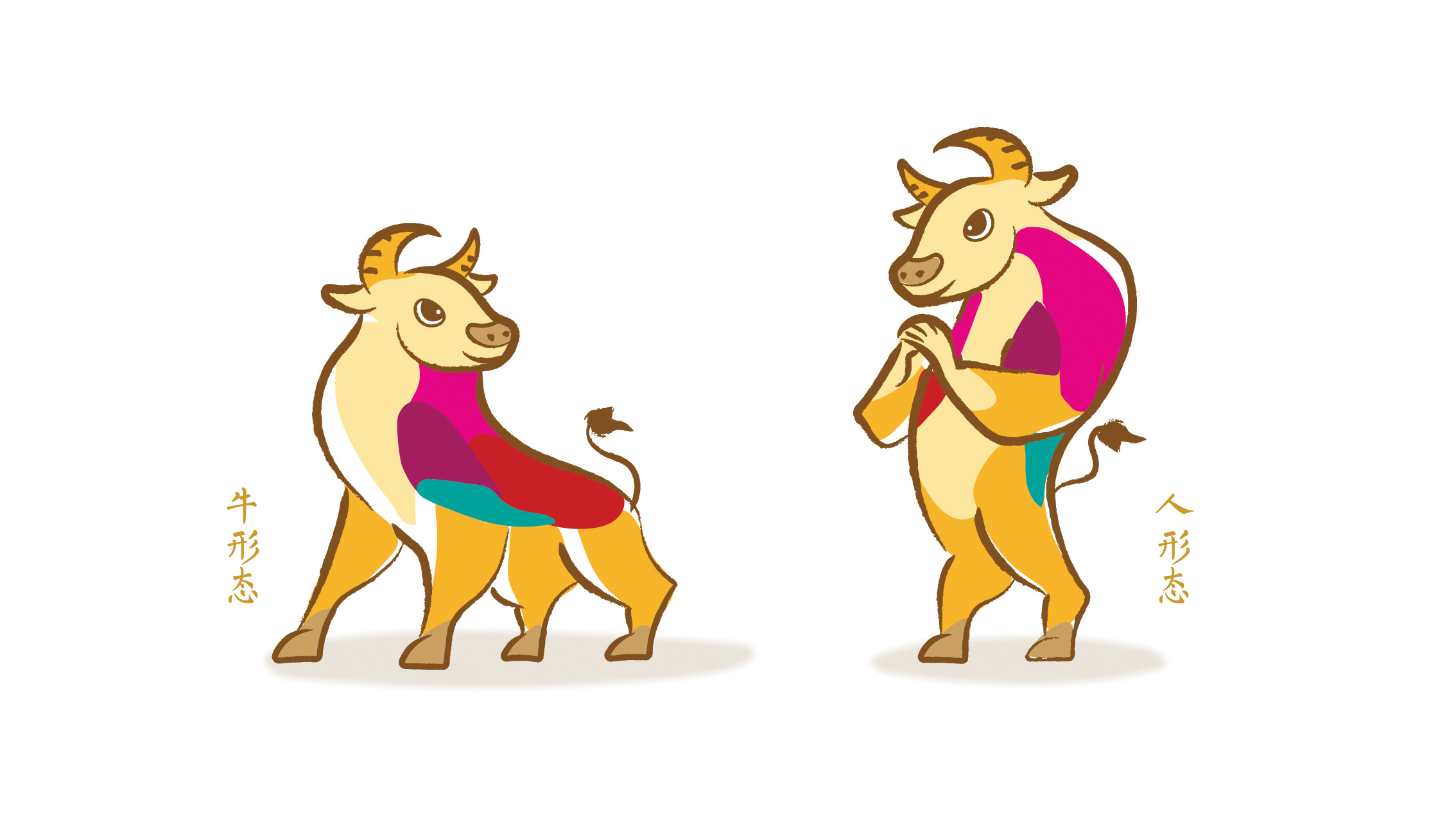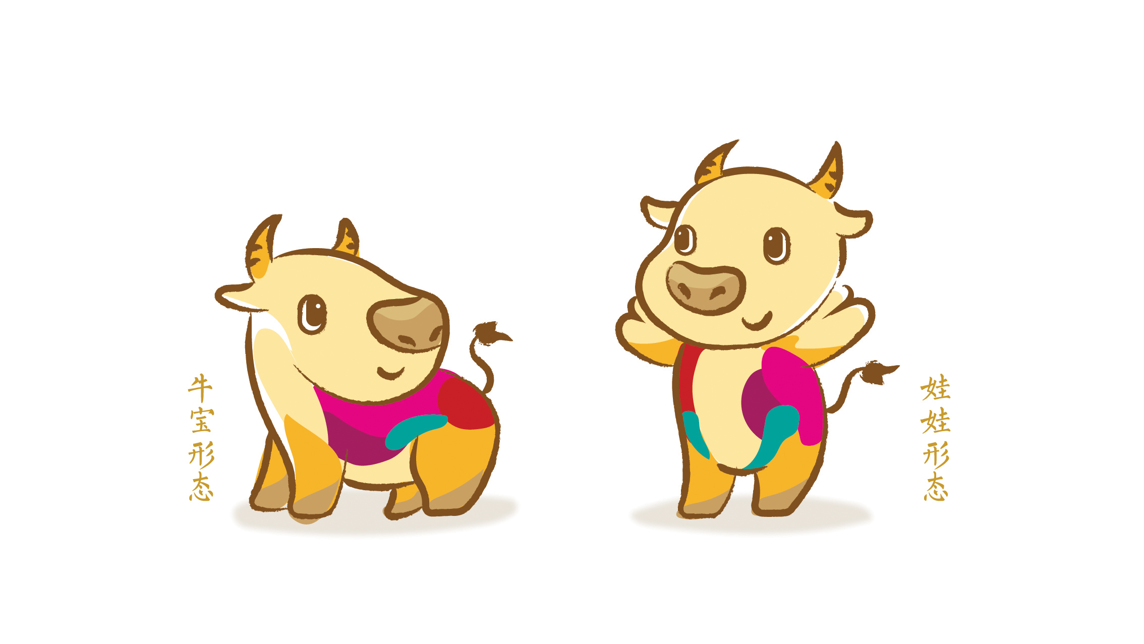 团队的工作远不止制作《小昂》本身。在《小昂》定稿之前,设计团队勾画了数套吉祥物形象方案,如神话传说中的草药牛、强身健体的武术牛、民俗风格的折纸牛等,以及央视春晚logo方案。