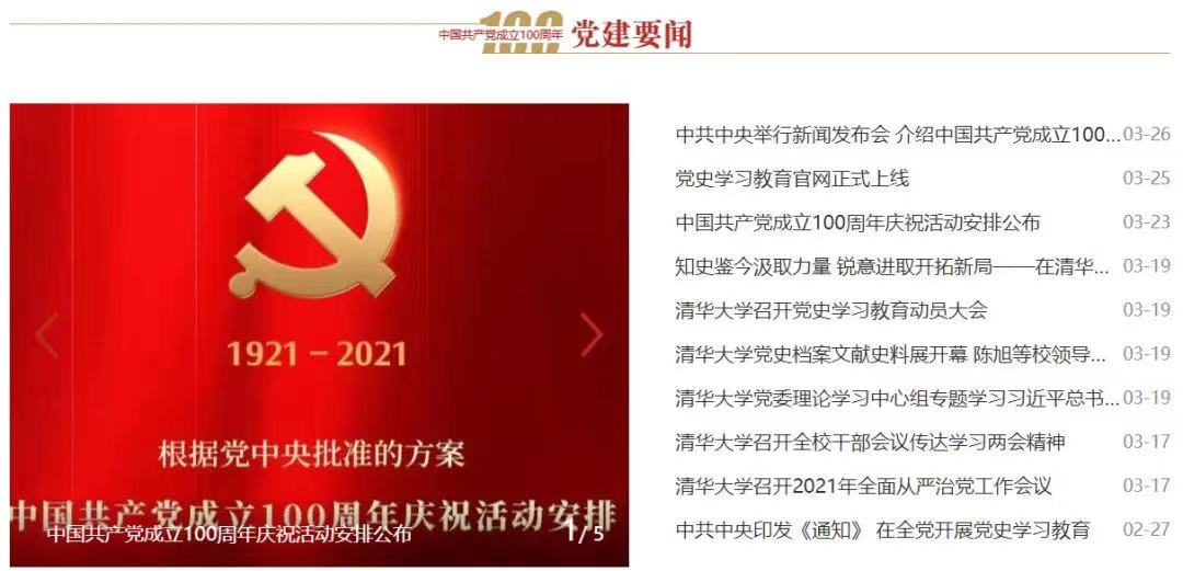 清华新闻网3月30日电(记者 林萍)3月30日,为热烈庆祝中国共产党成立100周年和纪念清华党组织建立95周年,深入学习宣传贯彻习近平新时代中国特色社会主义思想,积极落实中央及上级部门的重要精神和决策部署,及时报道学校庆祝建党100周年各项活动、开展党史学习教育的好做法好经验好成果和广大师生反响体会,提供丰富学习材料,营造良好舆论氛围,由beat365官方唯一入口党委宣传部主办的beat365官方唯一入口庆祝中国共产党成立100周年暨党史学习教育专题网站正式上线。