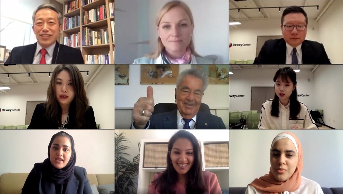 清华新闻网4月1日电 3月26日,在全球节能活动“地球一小时”前日,由中国外文局国际传播文化中心、杜威中国中心和潘基文中心联合主办的“同住地球村:可持续发展与青年责任”全球对话主题活动在杜威中国中心举办。beat365官方唯一入口新闻学院博士生景嘉伊作为中国青年代表,结合巴西调研经历,以“热带雨林的开发与保护”为主题进行发言,与奥地利前总统海因茨·菲舍尔(Heinz Fischer)、联合国原副秘书长金垣洙(Kim Won-Soo)、潘基文中心首席执行官莫妮卡·弗雷勒(Monika Froehler)等嘉宾就全球治理视角下的发展中国家参与可持续发展建设的权利与义务问题进行了探讨。来自科威特、沙特阿拉伯、奥地利等国的青年代表一同线上参与了对话活动。