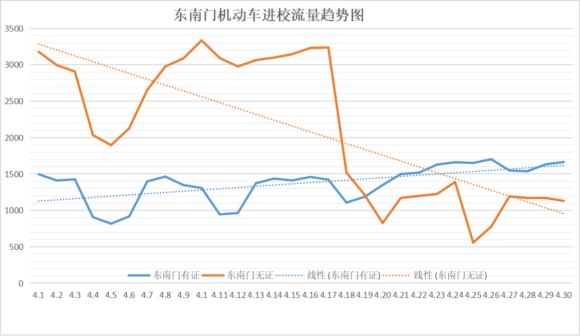 2021年4月的东南门机动车通行数据显示,政策调整后东南门秩序极大改善,本校教职工车辆通行东南门增多,来访车辆下降更显著,每天通行机动车降至5000辆次左右。东南门交通压力骤减,校内教职工车辆入校通行顺畅,入校拥堵等候的现象不再存在,也有效缓解了周边社会道路的交通压力。