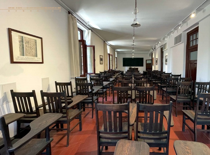 1920年,李大钊在这间教室为学生讲授《唯物史观》等马克思主义理论课程。同年8月,当时在教育部任职的鲁迅被蔡元培聘为北京大学讲师,在此讲授《中国小说史略》。(旧址复原:大教室)