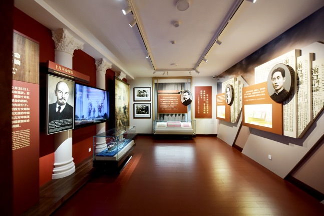展现俄国十月革命对中国的影响。西侧墙是俄国爆发十月革命的内容,展示视频:《十月革命》,并复制油画:《列宁宣布苏维埃政权成立》。