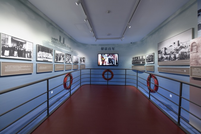 通过步入式体验场景及视频《留法百年》,将观众带入到赴法留学的轮船上。表现留法勤工俭学运动为中国的政治、科技、教育、文艺等领域造就了一大批人才。