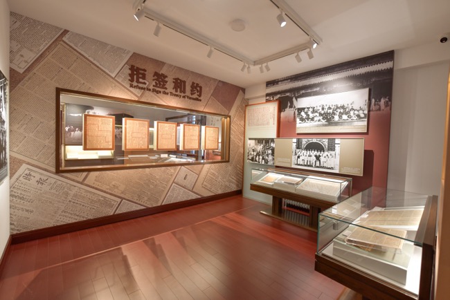 通过大型报刊墙、报刊文献原件和图片资料,展示1919年全国群众组织、各地爱国人士投入拒签和约的斗争,北洋军阀政府在民众压力下不得不罢免曹汝霖、陆宗舆、章宗祥的职务,最终中国参会代表拒绝签订凡尔赛和约。