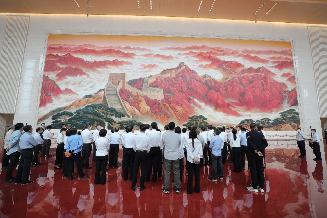 参观中,美术学院相关负责人和专家分别介绍了清华师生承担展览馆中大型漆壁画《长城颂》、岩彩壁画《长江三峡》《黄河壶口瀑布》等艺术作品创作与展览馆外立面装饰设计等重要任务的情况。