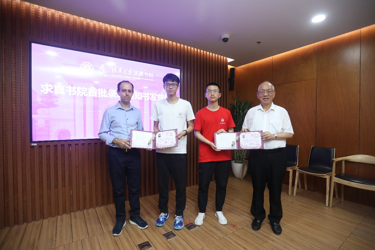 最后,伴随着求真书院院歌,丘成桐先生和比尔卡尔教授为参加仪式的学生发放了录取通知书并合影留念。