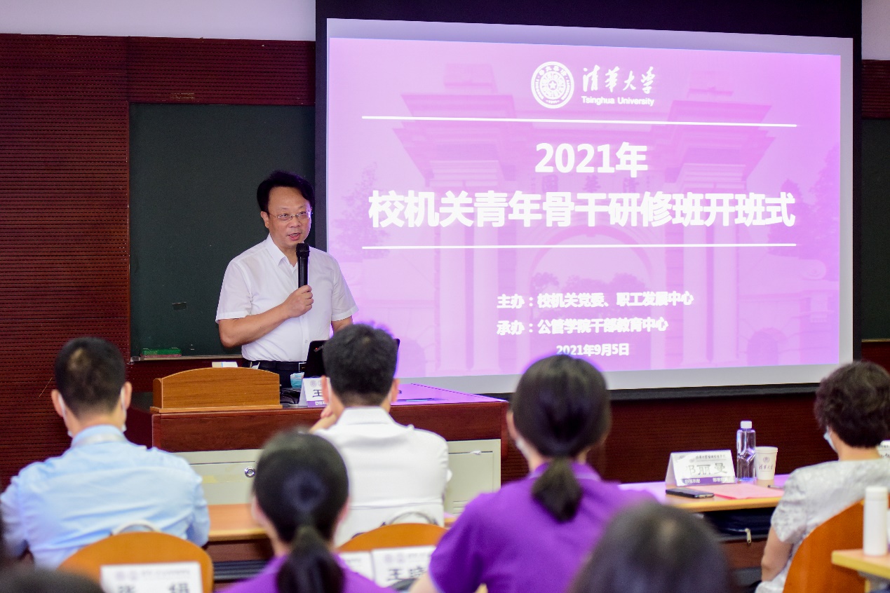 清华新闻网9月7日电(记者 赵姝婧)9月5日,由校机关党委、职工发展中心主办,公共管理学院干部教育中心承办的2021年校机关青年骨干研修班在公管学院开班。常务副校长、校机关党委书记王希勤出席开班式并讲话。校务委员会副主任、文科资深教授谢维和以“历史发展、时代方位与清华责任——党史学习之中国高校改革发展篇”为题,为研修班学员讲授了首门课程。来自校机关各职能部门、后勤系统和院系的38位青年骨干参加了研修班学习。