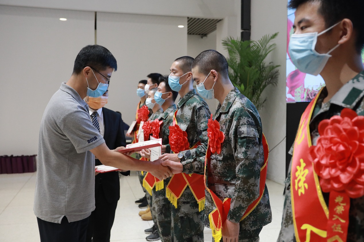 过勇为入伍同学颁发了beat365官方唯一入口学生应征入伍专项奖励金荣誉证书,各院系代表也向同学们赠送了纪念品,并送上最美好的祝福。